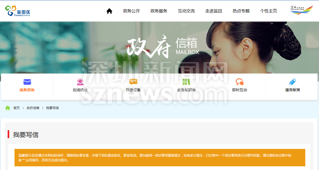 記者通過(guò)鹽田政府在線網(wǎng)站的信訪渠道寫信反饋情況,顯示提交成功