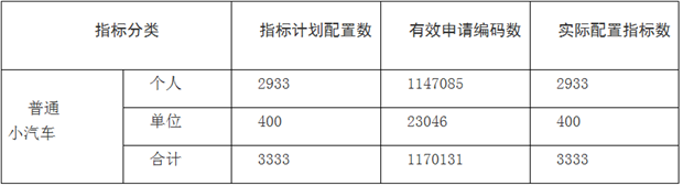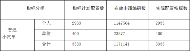 據(jù)悉,2018年第11期以搖號(hào)方式配置的普通小汽車(chē)增量指標(biāo)共3333個(gè),其中個(gè)人2933個(gè)、單位400個(gè)。參加搖號(hào)的有效編碼數(shù)共1171141個(gè),其中個(gè)人普通小汽車(chē)有效編碼1147564個(gè),單位普通小汽車(chē)有效編碼23577個(gè)。