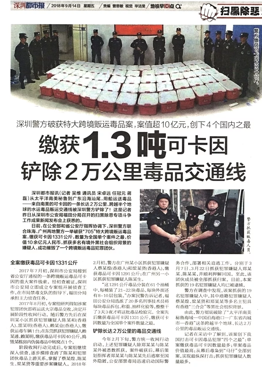 ★★在公安部和省公安廳指揮協(xié)調(diào)下,福田警方作為主力軍,聯(lián)合珠海、廣州兩地警方一舉破獲“705”特大跨境販運毒品案,創(chuàng)下我國打擊可卡因毒品犯罪“四個之最”:單案繳獲毒品可卡因數(shù)量最多;單案毒品價值最高;從幕后毒梟到“馬仔”全部到案,實現(xiàn)最縱深打擊;抓獲犯罪嫌疑人數(shù)量最多。