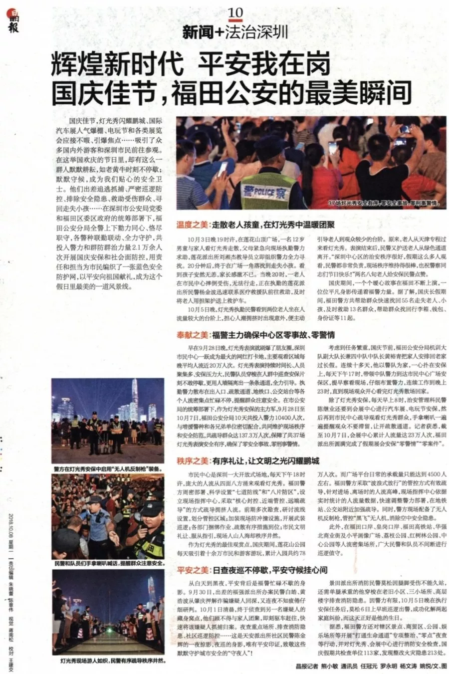 ★★深圳燈光秀表演持續(xù)時間長,每晚平均人流近20萬人次,安保工作強度大。福田分局參與安保工作的警力堅守崗位,維護現(xiàn)場秩序,在各個出入口、疏散通道、地鐵口、公交站臺等人流密集點都能看到他們忙碌的身影。