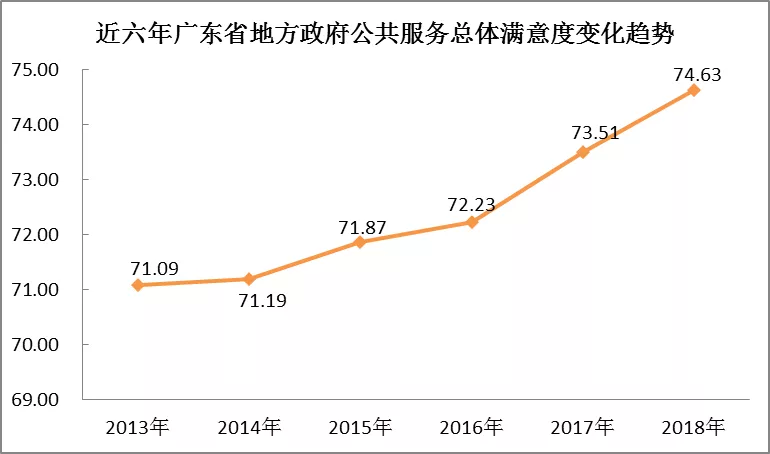 深圳新聞網(wǎng)2019年1月3日訊 近日,廣東省省情調(diào)查研究中心、廣東省社會科學(xué)院績效評估中心公布了《2018年廣東省地方服務(wù)型政府建設(shè)系列調(diào)研報告》(以下簡稱“報告”),今年該調(diào)研根據(jù)“公共服務(wù)”和“營商環(huán)境”雙向維度,由“廣東省地方政府公共服務(wù)公眾評價調(diào)查”和“廣東省營商環(huán)境公眾滿意度調(diào)查”兩個調(diào)查組成。今年調(diào)查共回收有效問卷28156份,結(jié)果顯示:2018年廣東省地方政府公共服務(wù)總體滿意度得分為74.63分,較去年提高1.12分,創(chuàng)十年來最高水平。