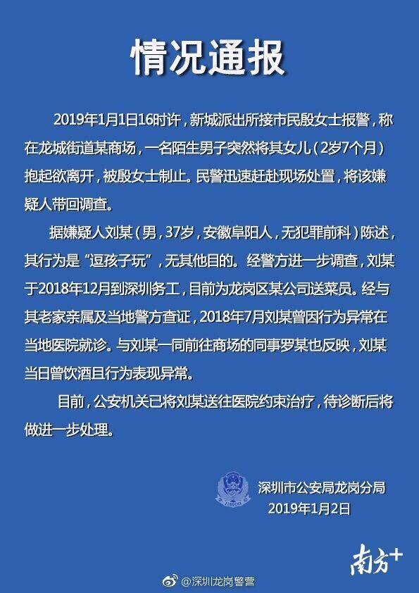 2019年1月2日,深圳市公安局龍崗分局發(fā)布情況通報(bào)稱:已將劉某送往醫(yī)院約束治療,待診斷后將做進(jìn)一步處理。