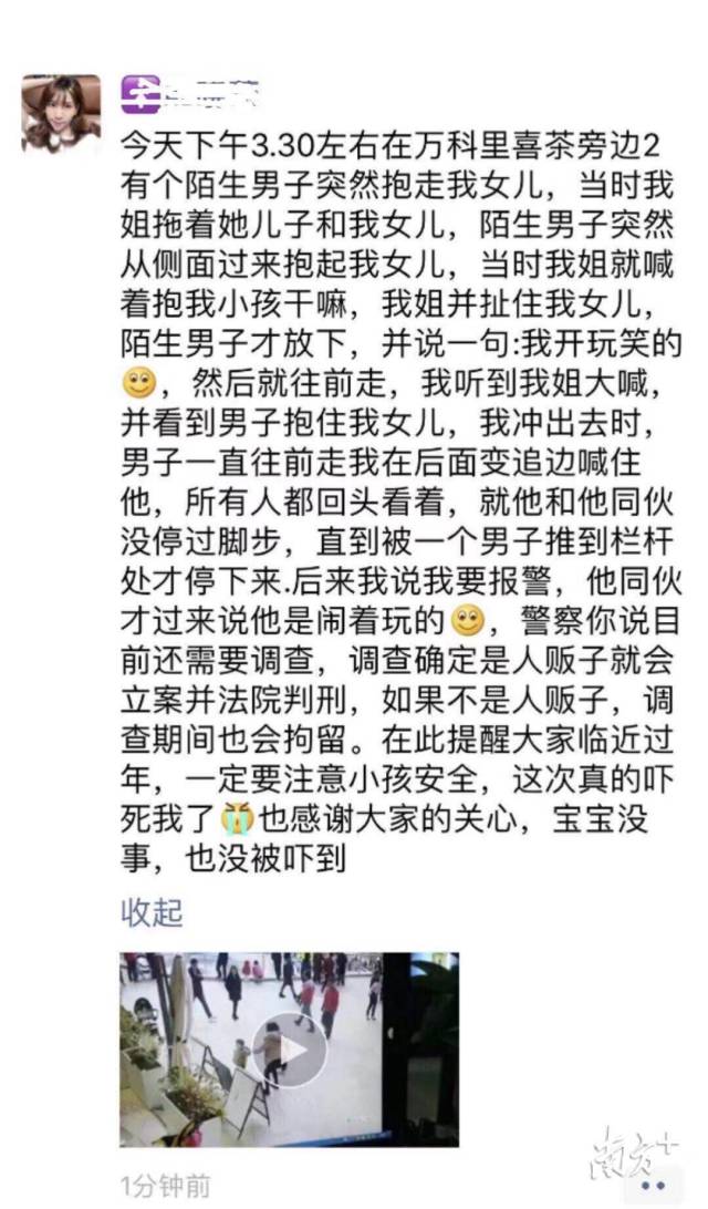 2019年1月1日下午,一位市民發(fā)朋友圈表示:在萬科里逛街時(shí),一名陌生男子突然上前抱走她的女兒,經(jīng)過拉扯制止,該男子才放下孩子。隨后,該女士報(bào)警,而男子則表示自己是鬧著玩的。