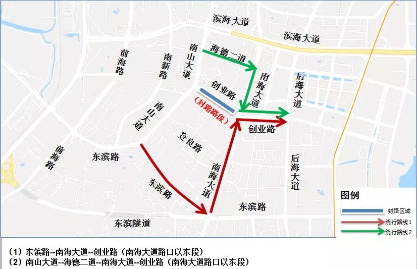 原經(jīng)南山大道轉(zhuǎn)入創(chuàng)業(yè)路東行,前往南海大道北行的車輛,可改沿南山大道北行,或經(jīng)東濱路轉(zhuǎn)入南海大道北行。