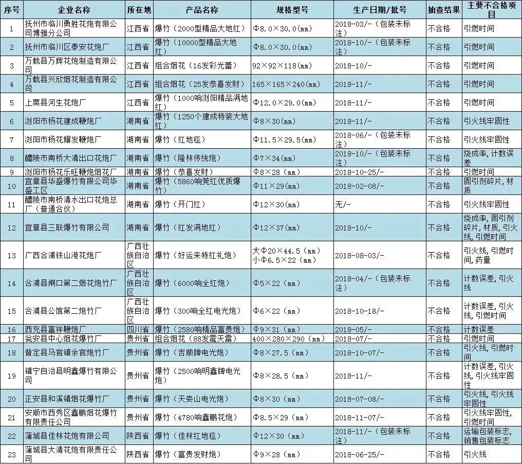 ③國家市場監(jiān)管總局日前組織開展煙花爆竹產(chǎn)品質(zhì)量國家監(jiān)督專項(xiàng)抽查,共抽查6個省(自治區(qū))150家企業(yè)生產(chǎn)的150批次產(chǎn)品,檢出23批次不合格,不合格發(fā)現(xiàn)率為15.3%。