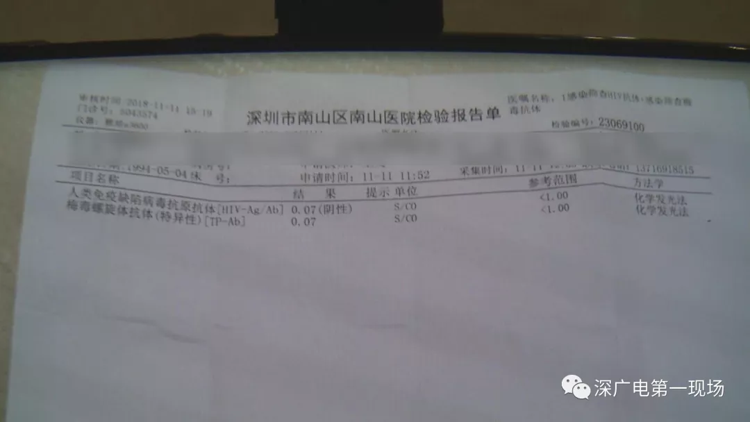 隨后,記者撥打吳某的電話,對報料人所說的情況進行核實。電話中吳某告訴記者說他的病已經治好了,并且給記者發(fā)來一張2018年11月11日,南山醫(yī)院的檢驗報告單。