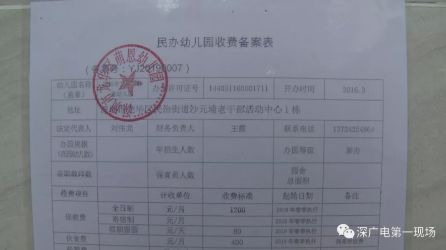 對(duì)此,龍華教育主管部門回復(fù):2016年3月同意萌恩幼兒園設(shè)立;2018年7月該園取得民辦非企業(yè)單位登記證書的辦學(xué)資質(zhì),2018年12月向教育局申請(qǐng)了收費(fèi)備案;2019年1月批復(fù)同意他們的收費(fèi)標(biāo)準(zhǔn)。