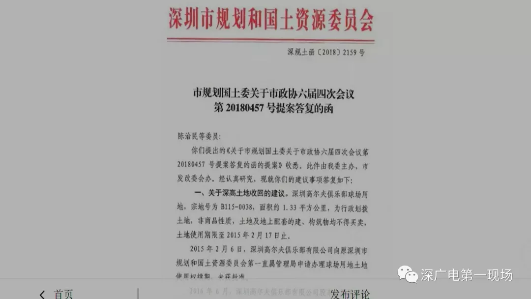 陳治民的提案,在去年獲得了深圳市規(guī)劃國土委的回復(fù),稱目前“深高”收地工作正有序開展中,根據(jù)相關(guān)法律法規(guī),深圳高爾夫球場B115-0038宗地的土地使用權(quán),將被無償收回,地上建筑物、構(gòu)筑物等將給予適當(dāng)補(bǔ)償。