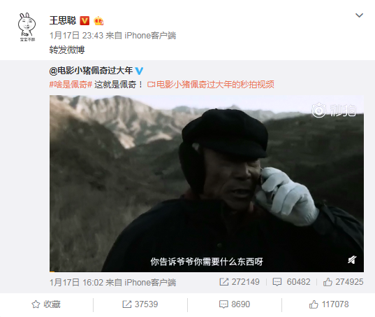 王思聰轉(zhuǎn)發(fā)《啥是佩奇》宣傳片的微博截圖