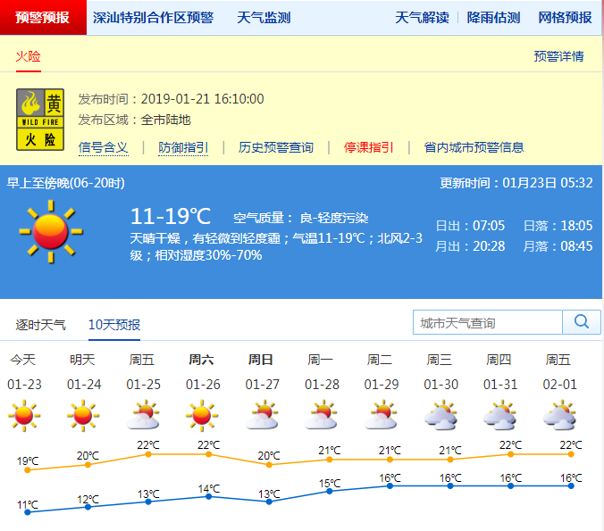 深圳新聞網2019年1月23日訊 深圳今日白天,天氣干燥,部分地區(qū)能見度較低,有輕微到輕度霾;氣溫11-19℃;偏北風2-3級;相對濕度30%-70%,濕度低,火險預警生效中。24-27日依然晴天干燥,部分時間有輕微到輕度霾;28日多云,濕度回升。天氣持續(xù)干燥,日溫差大,早晚較冷。