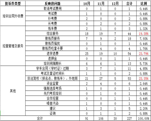 2018年第四季度投訴類別統(tǒng)計一覽表