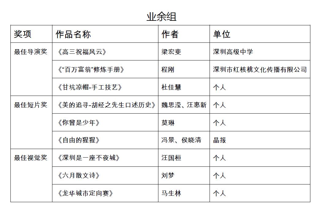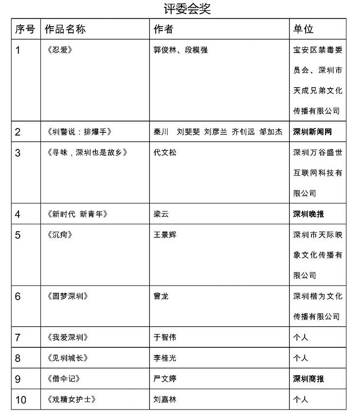 作為創(chuàng)意12月活動的重頭項目,本次視頻大賽由深圳報業(yè)集團、深圳市網(wǎng)絡媒體協(xié)會主辦,深圳新聞網(wǎng)、深圳市中影南方廣告有限公司、深圳市上御同禧文化傳播有限公司承辦,面向社會共征集到視頻作品500余部。大賽組委會邀請了專業(yè)媒體人士和影視大咖擔任評委,共有70件作品入圍終評會,經(jīng)過組委會辦公室的最終評選,最終確定了獲獎作品。參加比賽的,既有新聞媒體界和廣告公司的專業(yè)人士,也有各行各業(yè)熱愛視頻拍攝制作的“發(fā)燒友”,參賽作品題材廣泛,既有記錄深圳城市風貌的視覺大片,也不乏故事性強、拍攝剪輯手法新穎、主題立意深刻的作品。