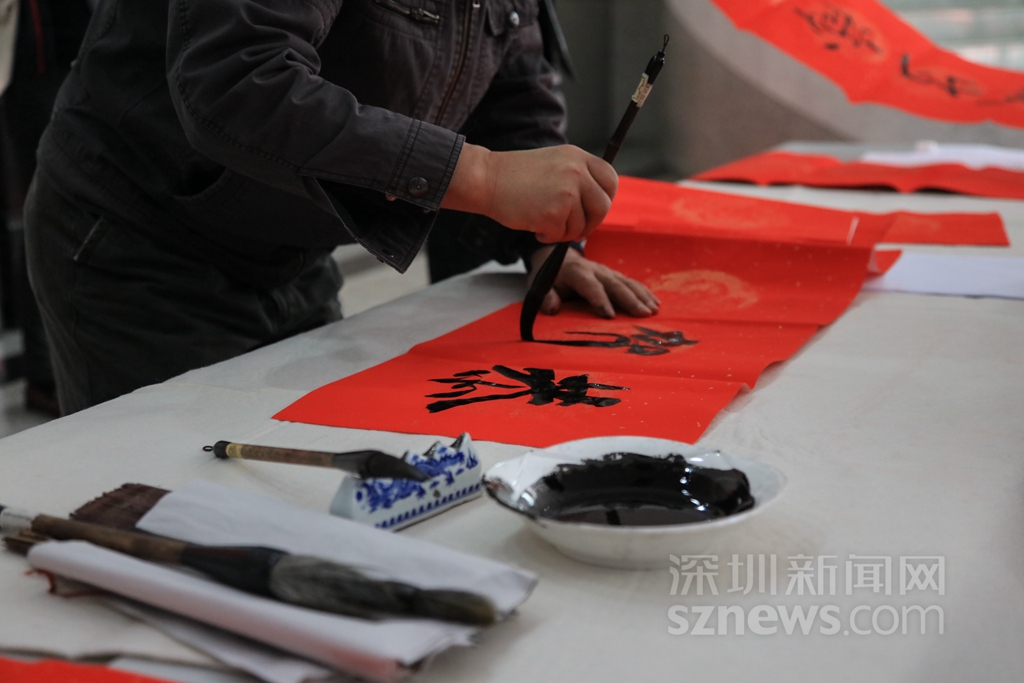 過年貼春聯(lián),是中華民族的傳統(tǒng)習(xí)俗之一??梢哉f,春聯(lián)一出,年味十足。記者在深圳商報大廈一樓活動現(xiàn)場看到,工作人員早已準(zhǔn)備好了春聯(lián)的紅紙和筆墨,多位書法了得的記者編輯揮毫潑墨,創(chuàng)作出了一幅幅寓意喜慶吉祥的對聯(lián),并免費贈送給同事。不少人為了能拿到新鮮出爐的春聯(lián),提前在現(xiàn)場排隊等候。