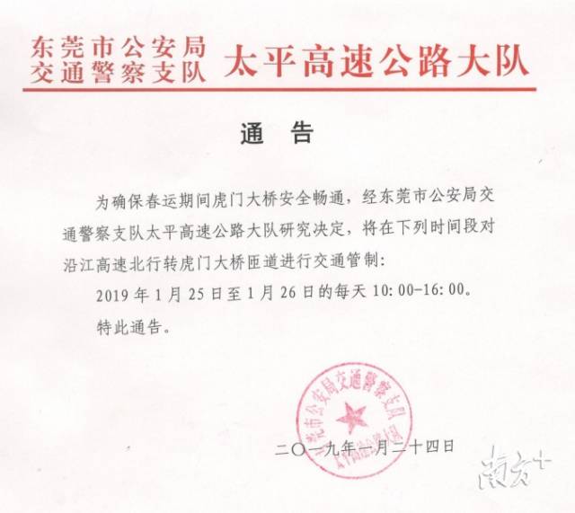 為確保春運期間虎門大橋安全暢通,經(jīng)東莞市公安局交通警察支隊太平高速公路大隊研究決定,2019年1月25日至1月26日的每天10:00-16:00,對沿江高速北行轉(zhuǎn)虎門大橋匝道進(jìn)行交通管制。