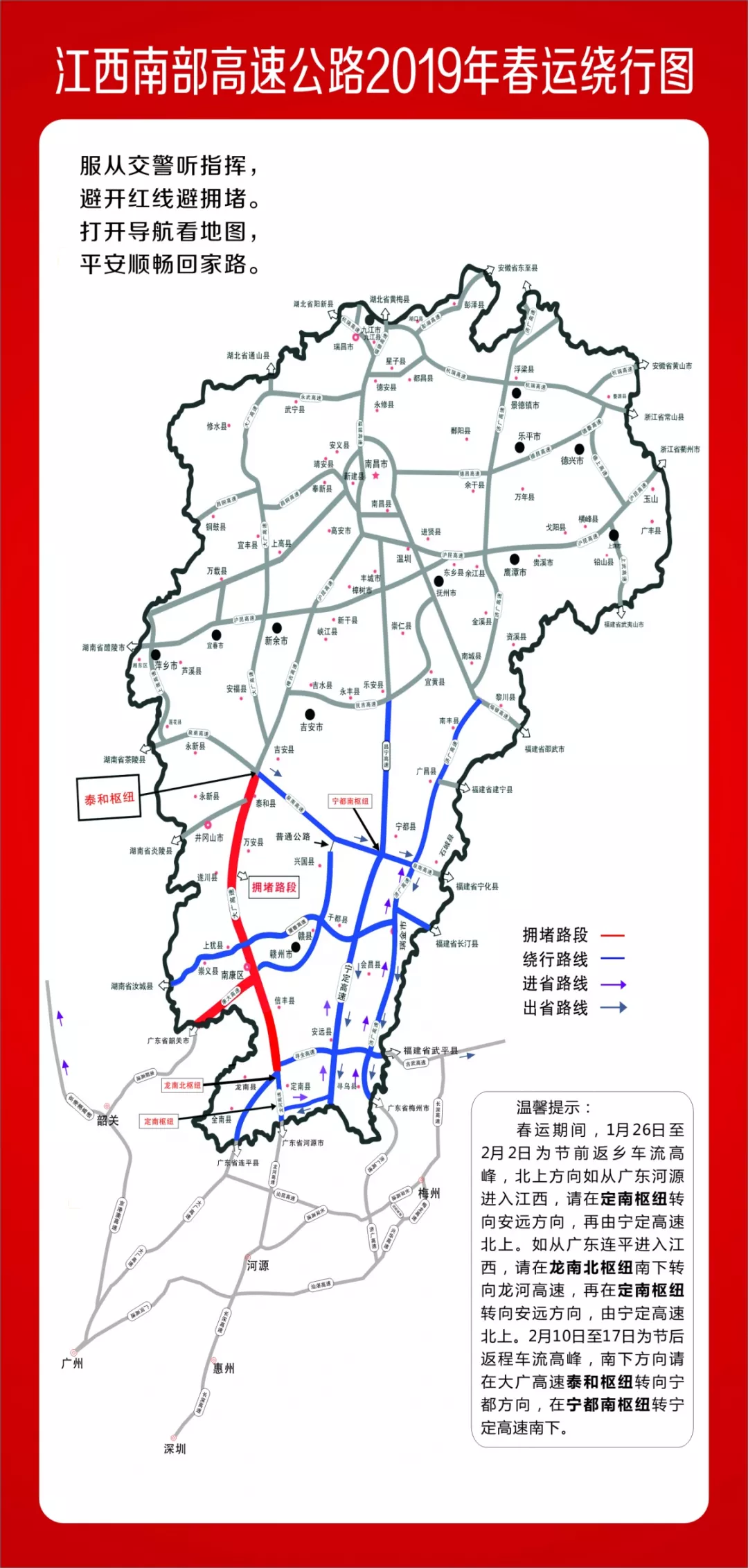 由長(zhǎng)深高速北上,在廣東河源市境內(nèi)轉(zhuǎn)龍河高速進(jìn)入江西,后由定南樞紐轉(zhuǎn)寧定高速聯(lián)絡(luò)線(S86),38公里后再由寧定高速北上,以避開(kāi)大廣高速擁堵路段。