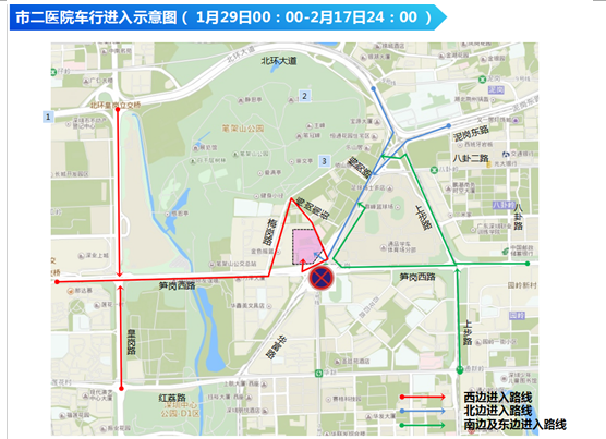 市二醫(yī)院車行進(jìn)入示意圖--紅色線條為西邊進(jìn)入醫(yī)院道路,藍(lán)色線條為北邊進(jìn)入醫(yī)院道路,綠色線條為南邊及東邊進(jìn)入路線。