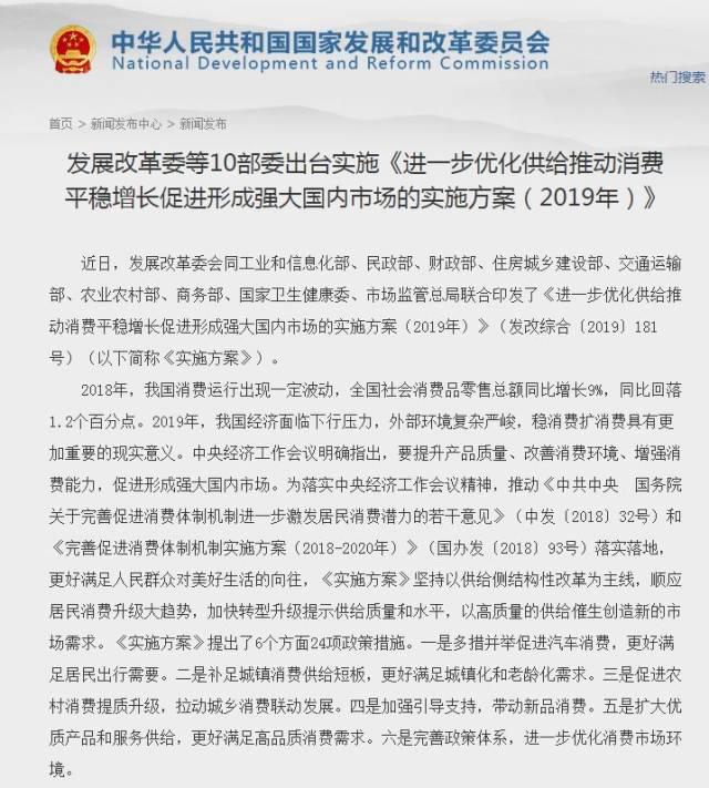 南方+2019年1月30日訊 1月29日,發(fā)改委等部門印發(fā)《進(jìn)一步優(yōu)化供給推動(dòng)消費(fèi)平穩(wěn)增長促進(jìn)形成強(qiáng)大國內(nèi)市場的實(shí)施方案 (2019年 ) 》(以下簡稱《方案》)。