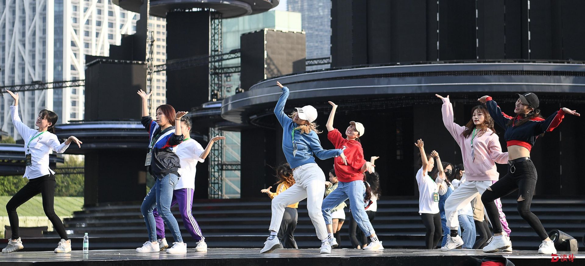 “你們的目光所及都是舞臺!”當(dāng)記者當(dāng)天下午來到市民中心廣場時彩排,分會場總導(dǎo)演孫濱指著搭建的主舞臺、舞臺前方的階梯和廣場、以及舞臺后方的高樓大廈這樣說。