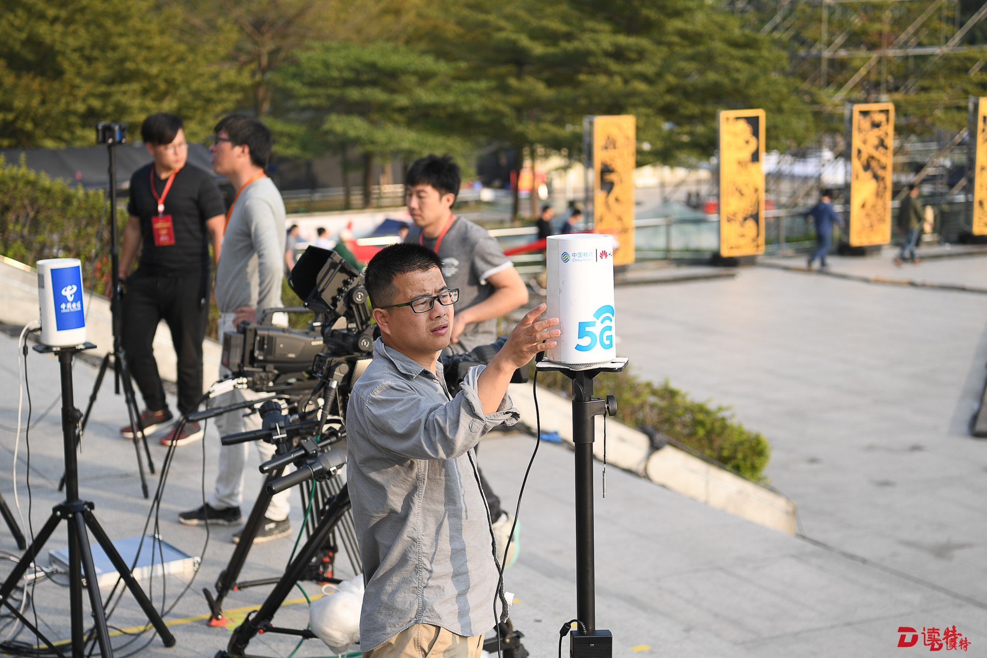 在市民中心廣場,央視的5G網(wǎng)絡(luò)VR實時制作團(tuán)隊連日來已經(jīng)在反復(fù)調(diào)試設(shè)備。記者看到,他們的設(shè)備相當(dāng)簡單便捷,包括有6個鏡頭的全景攝像頭和5G網(wǎng)絡(luò)接入終端,工作人員手持兩臺筆記本電腦用于現(xiàn)場VR視頻的縫合,從而實現(xiàn)VR超高清視頻通過5G網(wǎng)絡(luò)的制作和回傳。