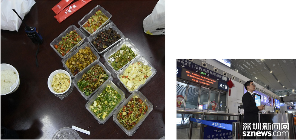春運第一天,人流如織。從下午2點半上班開始,聶新強忙了5個鐘頭,安全送走大約20萬人。晚上七點半,在各閘機口頂替了五位同事吃晚飯之后,聶新強終于吃上了“豪華”外賣“快餐”,“豪”的是一人獨享八人份,“快”的是只用了10分鐘不到就結(jié)束了戰(zhàn)斗。