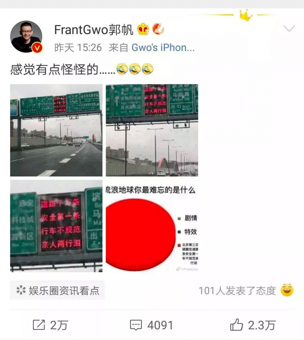 這些現(xiàn)實(shí)中的畫(huà)面,也把導(dǎo)演"驚動(dòng)"了,郭帆導(dǎo)演發(fā)微博表示有點(diǎn)怪怪的。
