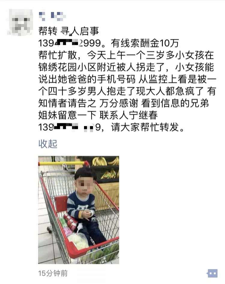 深圳晚報2019年2月13日訊 2月10日晚間一則內容為"家長懸賞10萬元尋找3歲被拐女孩"的消息,刷爆了很多網(wǎng)友的微信朋友圈。"幫忙擴散,3歲女孩在錦繡花園小區(qū)被拐走,家長拿出10萬元酬金尋人……"網(wǎng)友紛紛傳遞愛心的同時,也在為女孩的安危捏著一把汗。然而,記者調查發(fā)現(xiàn)實際情況卻并非如此......