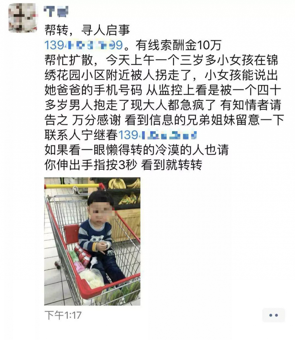 2月10日晚間,不少人的微信朋友圈被一條尋人消息刷屏。消息稱,一名3歲女孩在錦繡花園小區(qū)附近被人拐走,小女孩能說出她爸爸的手機號碼。從監(jiān)控上看,她是被一名40多歲的男人抱走了。