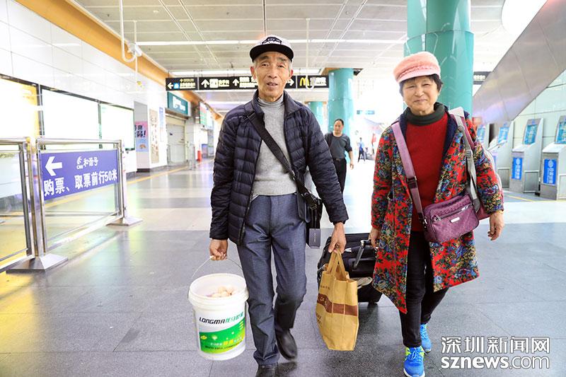 不少旅客攜帶當(dāng)?shù)厮约凹亦l(xiāng)特產(chǎn)返回深圳,圖中這一家人下車后整理行李