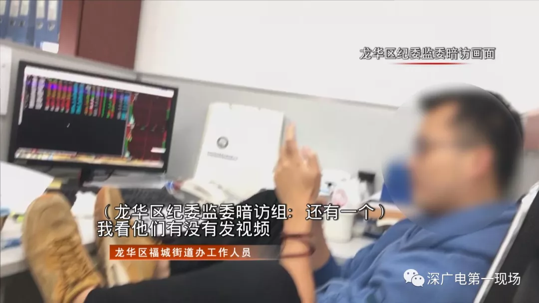 但暗訪組在調(diào)查中發(fā)現(xiàn),福城街道建筑工程事務(wù)中心有一名工作人員上班時間把腿翹到桌子上玩手機(jī)、看股票。