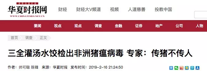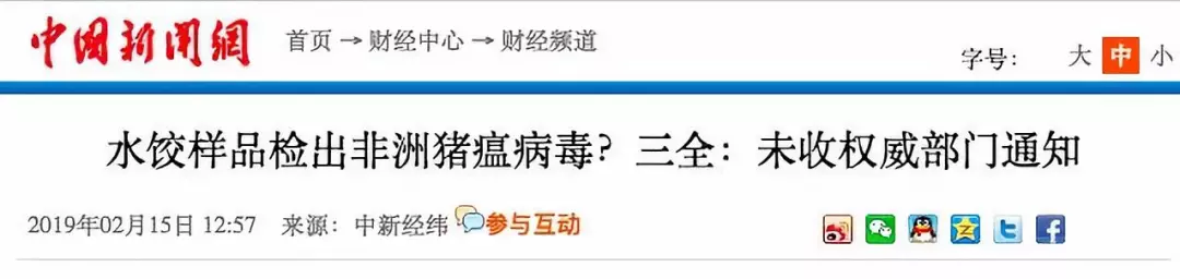 據(jù)紅星新聞報(bào)道,多家媒體稱,2月9日,湖南省湘西自治州重大動物疫病防制指揮部辦公室接到省防治重大動物疫病指揮部辦公室通知,要求瀘溪縣重大動物疫病防制指揮部辦公室對來源于吉首市凌云冷凍食品批發(fā)部凍庫的產(chǎn)品進(jìn)行抽樣,在瀘溪縣好又多和萬家福兩家超市共抽取4個(gè)批次12份樣品,經(jīng)州動物疫病預(yù)防控制中心檢測,其中由河南三全食品有限公司生產(chǎn)批次為20190113H的“三全灌湯水餃”3份樣品為非洲豬瘟病毒核酸陽性。