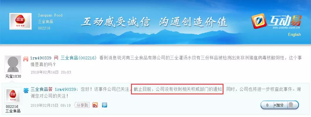 中新經(jīng)緯客戶端報(bào)道,14日晚間,有投資者在深交所互動平臺上提問三全食品稱,有消息稱三全灌湯水餃有三份樣品被檢測出非洲豬瘟病毒核酸陽性,該事件是否真實(shí)?