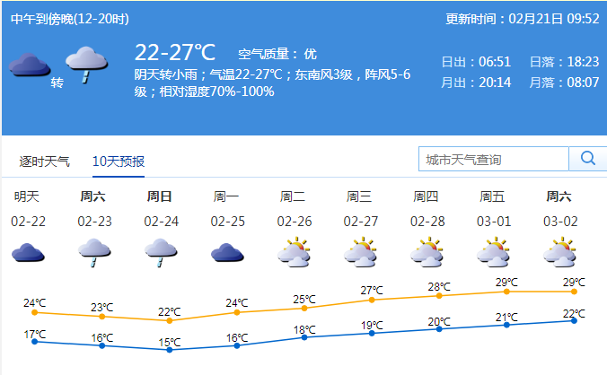 記者從深圳市氣象局了解到,21日深圳市以多云轉(zhuǎn)陰天為主,有分散小雨;氣溫在21-27℃;東南風2-3級;相對濕度65%-95%。
