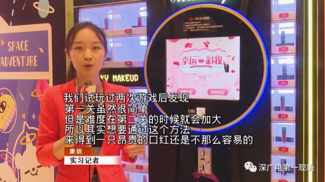 在福田區(qū)的一家商場的醒目位置,擺放著幾臺口紅機,機器上有幾十個透明的小格子,里面都擺放著大牌口紅。但想要得到口紅,就得先玩游戲,游戲一共有三關(guān)。依托于一個糖果轉(zhuǎn)盤,每關(guān)糖果旋轉(zhuǎn)的速度都會提高一些,只有全部通關(guān)之后,才能拿到心儀的口紅。