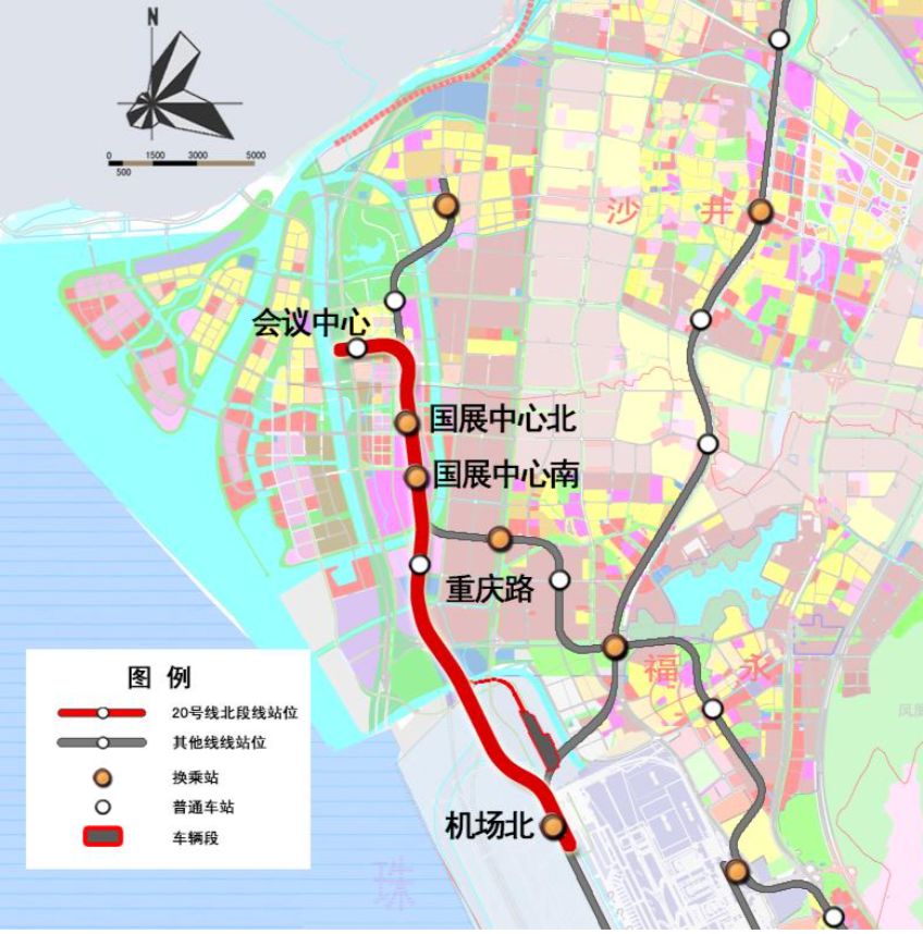 20號線北段起于寶安國際機(jī)場規(guī)劃 T4航站樓,在規(guī)劃 T4航站樓北側(cè),11號線東側(cè)設(shè)機(jī)場北站,與11號線、穗莞深城際線換乘。之后線路往北沿展覽大道敷設(shè),經(jīng)蠔業(yè)路后轉(zhuǎn)向北,于重慶路北側(cè),展覽大道東側(cè)設(shè)重慶路站。線路繼續(xù)往北,沿新會展中心東側(cè)道路敷設(shè),于景芳路南側(cè)設(shè)國展中心南站,與12號線換乘,在鳳塘大道路口設(shè)國展中心北站,與12號線、30號線換乘。線路自國展中心北站引出后,于和蕙路向東敷設(shè),于海濱大道東側(cè)設(shè)會議中心站。線路全長約8.4km,采用地下敷設(shè)。