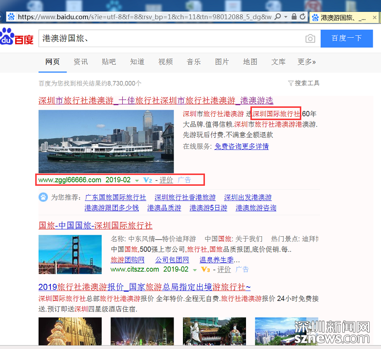 深圳市消委會模擬消費(fèi)者網(wǎng)絡(luò)搜索實(shí)際使用場景,在百度搜索中搜索“港澳游國旅”等關(guān)鍵詞,進(jìn)行了專項(xiàng)測試調(diào)查。調(diào)查發(fā)現(xiàn),搜素“港澳游國旅”等關(guān)鍵詞時(shí)搜索頁面會出現(xiàn)加V等級認(rèn)證的旅行社廣告信息,但經(jīng)核實(shí),“深圳信用網(wǎng)”商事主體登記信息中并無該企業(yè)。