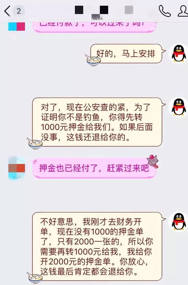 轉賬后,小李同學到一酒店開好房間,靜等“小妹”上門,但此時,對方要求再交1000元“風險押金”才能安排“小妹”過來。
