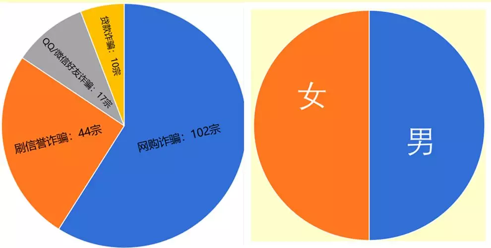 其中,以網(wǎng)購和刷單詐騙占比最大,受害學(xué)生男女比例基本持平。