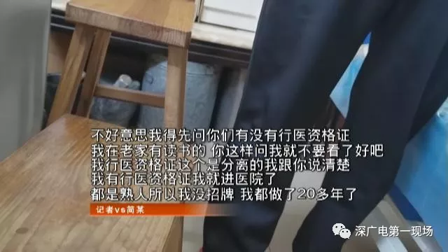 簡某的名片上,印著他是醫(yī)學(xué)院畢業(yè),有20多年治療經(jīng)驗(yàn),他的治療對骨折脫位通風(fēng)腰突癥有特效,甚至半身不遂后遺癥都可以治。名片上,簡某有兩個營業(yè)點(diǎn),分別在龍崗坂田和布吉。但地址只顯示大范圍,沒有房號。原來,找他看病,先得電話預(yù)約,然后他才告訴你具體房號。昨天,記者想辦法預(yù)約到簡某,他說可以在坂田五和路附近的吉豐樓給記者看病。記者來到現(xiàn)場,看到樓下沒有任何標(biāo)識,不過電梯里有塊不大的牌子,寫著“跌打骨傷”電話號碼和門鈴0305字樣。