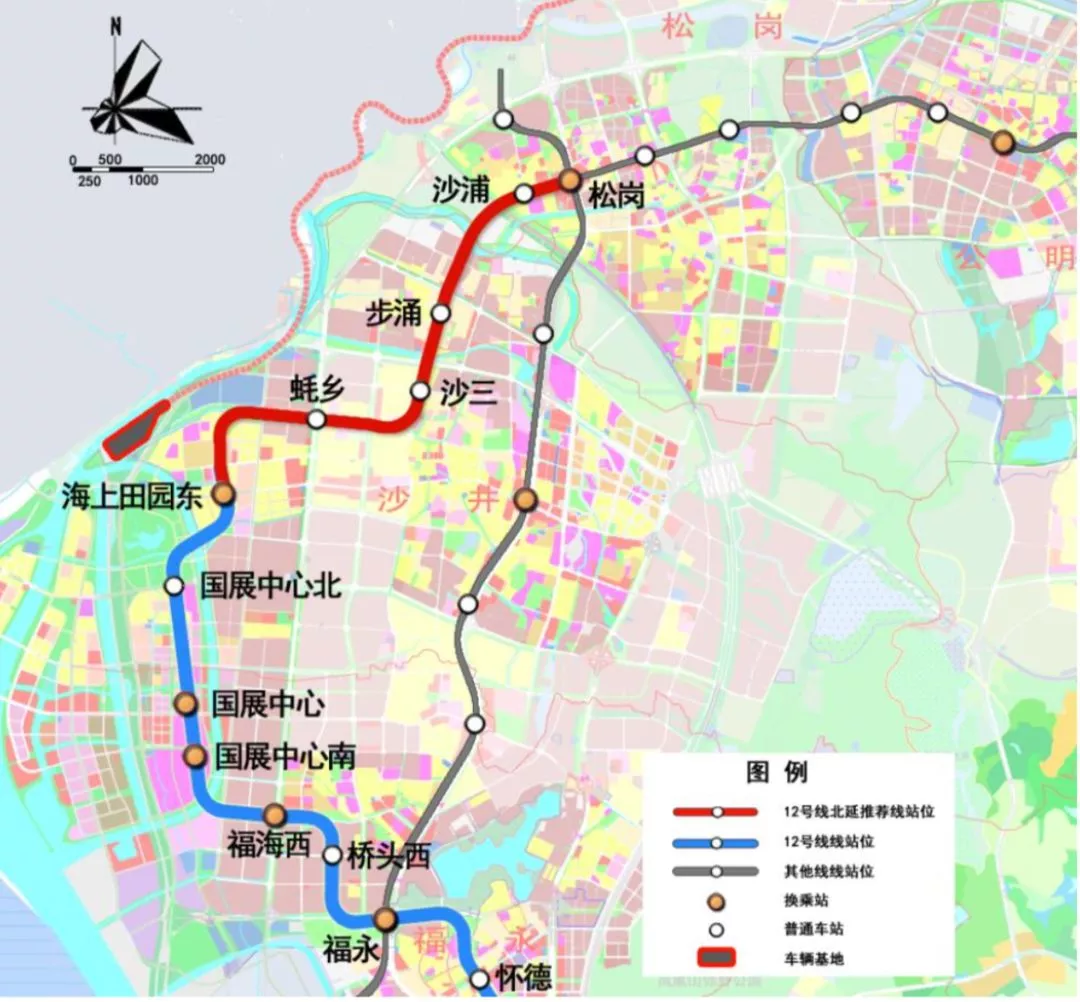 12號線北延線由在建地鐵12號線海上田園東站后,至沙江路與寶安大道交叉口前設(shè)置松崗站,與在建地鐵6號線和既有地鐵11號線換乘。全長約8.2公里,采用地下敷設(shè)。