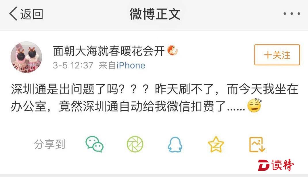 據(jù)微博網(wǎng)友“@面朝大海就春暖花會(huì)開(kāi)”反映,3月5日中午,自己坐在辦公室還被“深圳通+”小程序微信扣費(fèi)。市民何先生也致電本報(bào)說(shuō),“中午12點(diǎn)30分左右,自己坐312公交車,用微信深圳通小程序刷卡,被重復(fù)扣費(fèi)一次,聯(lián)系深圳通公司無(wú)人接聽(tīng)?!?/p>