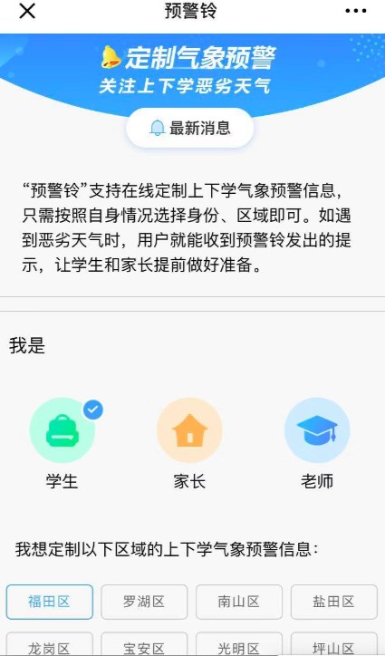 開學(xué)首日,深圳市氣象局就聯(lián)合深圳市教育局推出上下學(xué)時(shí)段高級別臺(tái)風(fēng)暴雨預(yù)警提示服務(wù)——“預(yù)警鈴”,廣大學(xué)生和家長可以通過關(guān)注“深圳天氣”微信公眾號進(jìn)入“市民互動(dòng)→預(yù)警鈴”頁面定制上下學(xué)預(yù)警信息,及時(shí)掌握自己所在區(qū)域的天氣狀況,合理安排出行,保障學(xué)生安全。