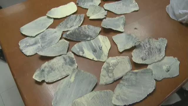 X光機(jī)隨后顯示出了一些神秘的黃色物體,該女子聲稱(chēng)是樹(shù)葉。海關(guān)關(guān)員發(fā)現(xiàn),女子所說(shuō)的“樹(shù)葉”每片都帶有褐色和淺黃色相間的花紋,淺黃色的地方顏色比較艷麗、通透,強(qiáng)光照射后還出現(xiàn)血色的紋理。