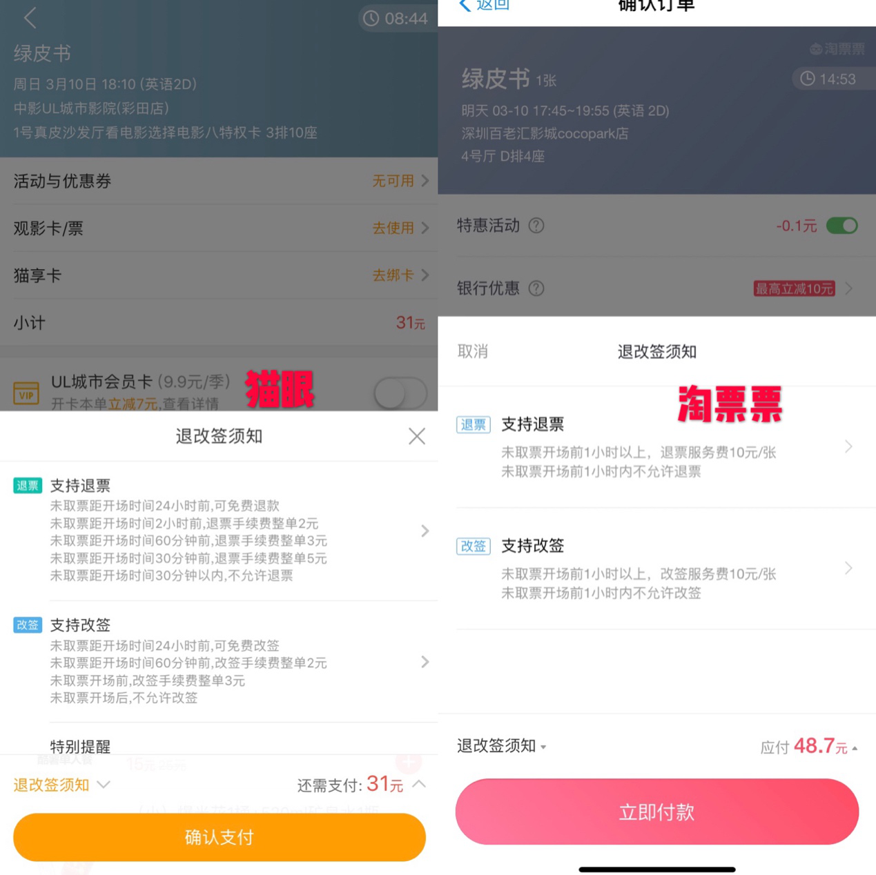 記者發(fā)現(xiàn),線上線下“退改簽”電影票均設置了門檻,對退票、改簽的時間和手續(xù)費均有不同的規(guī)定。