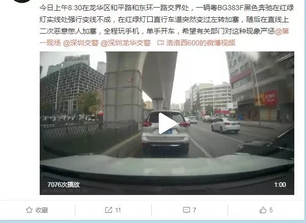深廣電直播深圳2019年3月13日訊 近日,深圳交警收到一則微博舉報,在龍華區(qū)和平路和東環(huán)一路交匯處,一輛黑色奔馳小車在等待紅綠燈時強行變線未果后在直行車道突然變道左轉(zhuǎn)加塞,險些與后方車輛發(fā)生擦碰事故。舉報人表示,當時黑色奔馳小車司機在駕駛車輛時不僅單手開車,更是全程玩手機。