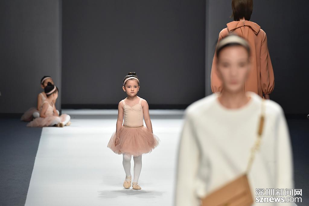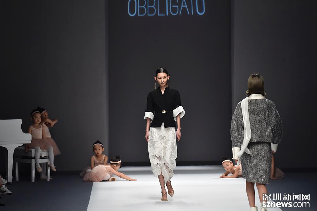 品牌OBBLIGATO展示環(huán)節(jié),參展的一位小孩子望向正在走臺(tái)的模特