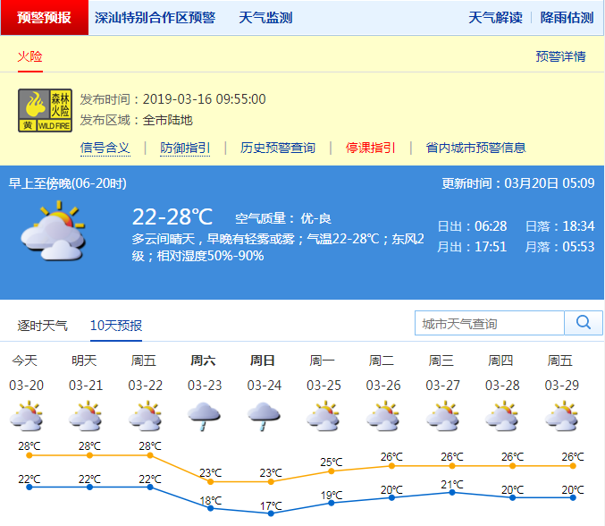 深圳新聞網(wǎng)2019年3月20日訊 深圳市氣象局預(yù)計20日多云間晴天,早晚有輕霧或霧;21-28℃;東風(fēng)2級;濕度50%-90%。21日云量增多,偶有分散陣雨;22-23日多云轉(zhuǎn)雷陣雨,可能伴有7-8級短時大風(fēng),氣溫下降;24-25日間中有短時陣雨;26日起轉(zhuǎn)多云。