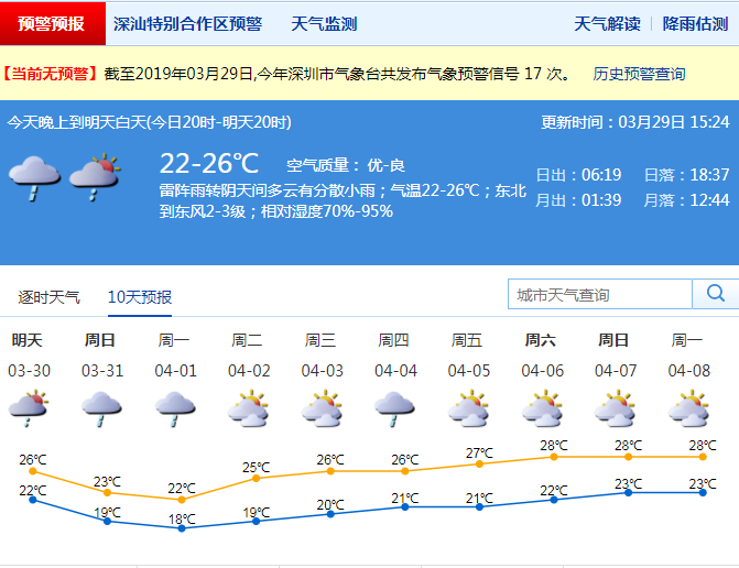 深圳市氣象局提醒市民,弱冷空氣周日(31日)白天影響我市,下周一(4月1日)早晨體感清涼,市民早晨外出注意及時添加衣服謹(jǐn)防感冒。目前處于季節(jié)轉(zhuǎn)換期,我市冷暖空氣活動頻繁,易出現(xiàn)雷雨大風(fēng)等強對流天氣,請廣大市民朋友們注意做好防范短時強降雨和雷雨大風(fēng)。