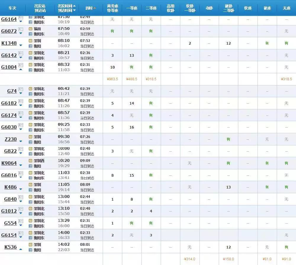 從深圳到衡陽,最快是2小時31分,票價最低為123元。