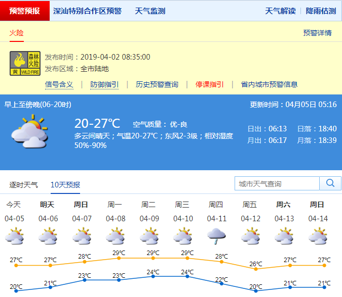 深圳新聞網(wǎng)2019年4月5日訊 深圳市氣象臺預(yù)計,清明假期(5-7日)我市多云可見陽光,溫暖干燥。其中,5日氣溫20℃-27℃,相對濕度50%-90%,東風(fēng)2-3級;6-7日多云可見陽光;8-10日以多云為主,氣溫繼續(xù)上升,偶有分散陣雨。