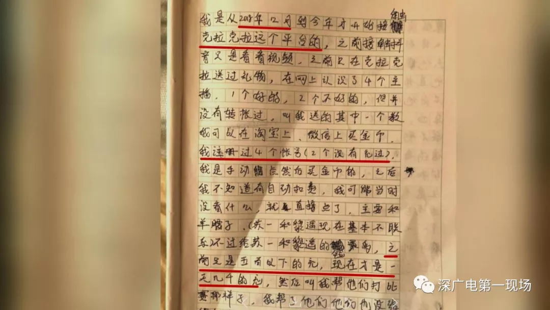 洋洋的媽媽說,發(fā)現(xiàn)自己的女兒刷掉了200萬,就要求女兒寫了一份檢討書。洋洋在檢討書上說,除了平時在平臺上進行互動,主播還跟自己加了微信好友,平時對自己特別關心,聊天的內(nèi)容好像關系很密切,說的話也都推心置腹一般,其中一個主播還說了,要和洋洋共同自殘?!